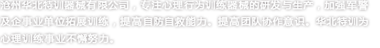 滄州華北特訓器械有限公司成立于2002年,是專業(yè)研發(fā)生產(chǎn)心理行為訓練器械、拓展器械、拓展器材、攀巖、兒童拓展器械的專業(yè)型企業(yè),并通過ISO-9001質(zhì)量管理體系認證及ISO-14001環(huán)境管理體系認證,致力于各職業(yè)群體提供的心理行為訓練器械、拓展器械、攀巖、兒童拓展器械等設備,使之不斷提升心理健康水平、充分開發(fā)自我潛能。我公司竭誠為廣大客戶提供專業(yè)化各類心理行為訓練器械相關(guān)產(chǎn)品和服務。